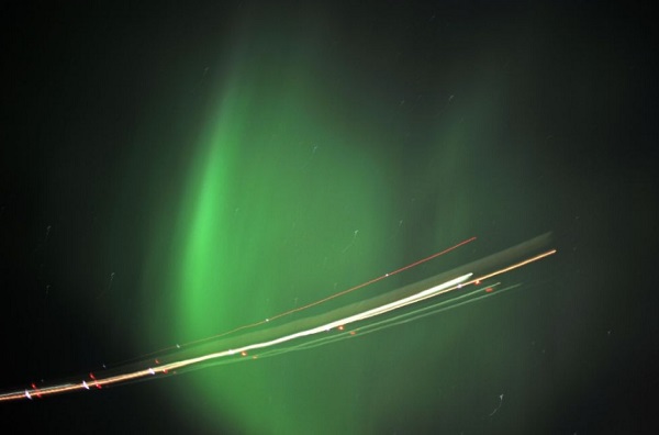 2021年3月20日凌晨,在美国阿拉斯加州安克雷奇,飞机飞过出现极光的天空。图源:新华社