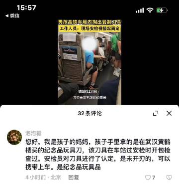 针对网传7月10日“G526次列车车厢男孩掏出刀具玩耍”的视频,中国铁路武汉局集团有限公司迅速展开调查。经核实,视频中的当事人为北京一学校游学团队的一名学生,持7月10日武汉至北京西的G526次列车车票,于14时55分,该游学团队从武汉站东进口3、4、5号通道安检依次进站,14时58分该学生的行李包在3号机被安检员查出疑似存在管制刀具,并开包检查出3把疑似刀具,该学生称是在黄鹤楼景点购买的模型纪念品,经安检人员确认为未开刃的刀具模型,根据《公安部关于管制刀具认定标准》第一条“未开刃且刀尖倒角半径R大于2.5毫米的各类武术、工艺、礼品等刀具不属于管制刀具范畴。”检查此玩具模型符合相关规定,便予以放行。该学生的母亲也证实是购买的模型纪念品。