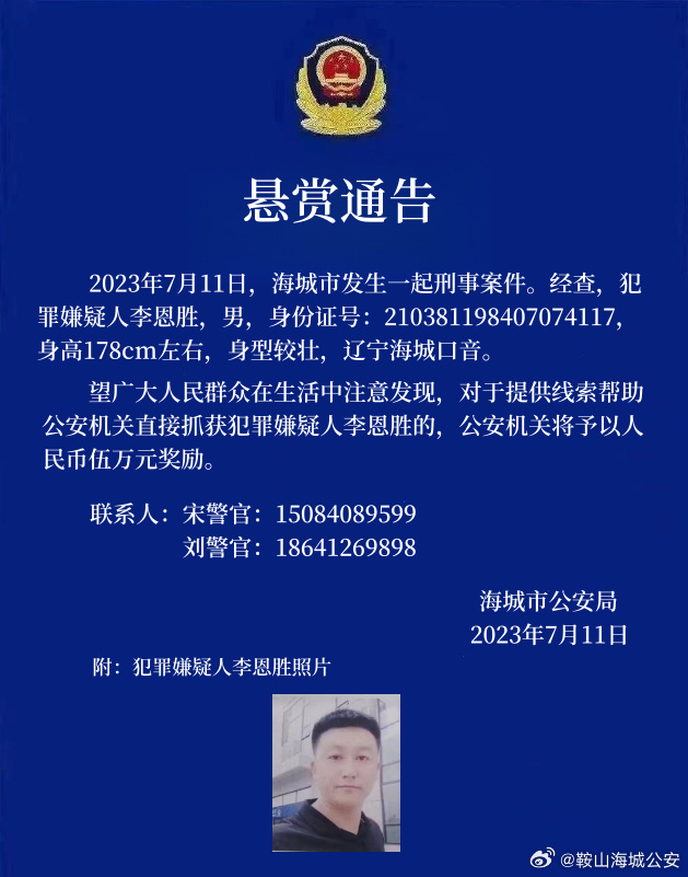 7月11日,辽宁鞍山海城市公安局发布一则悬赏通告。