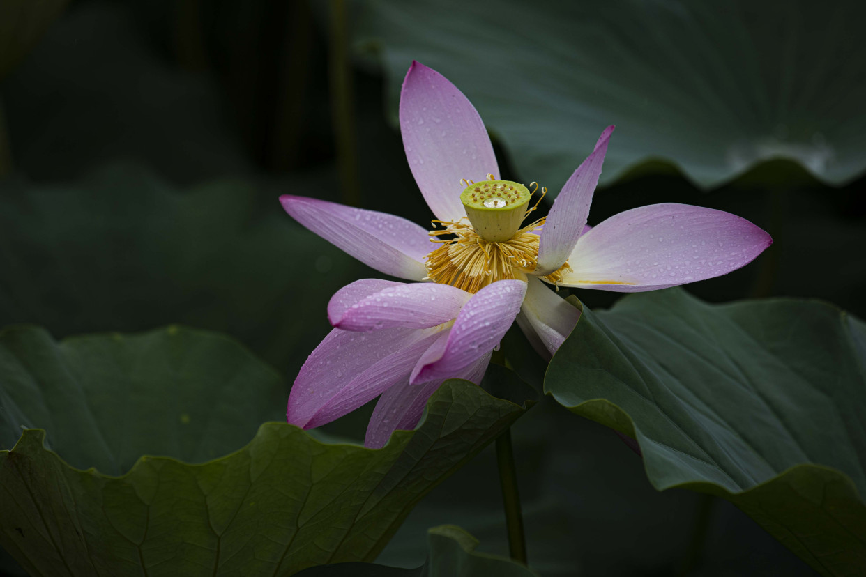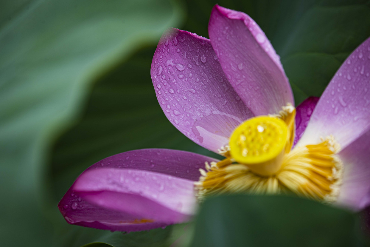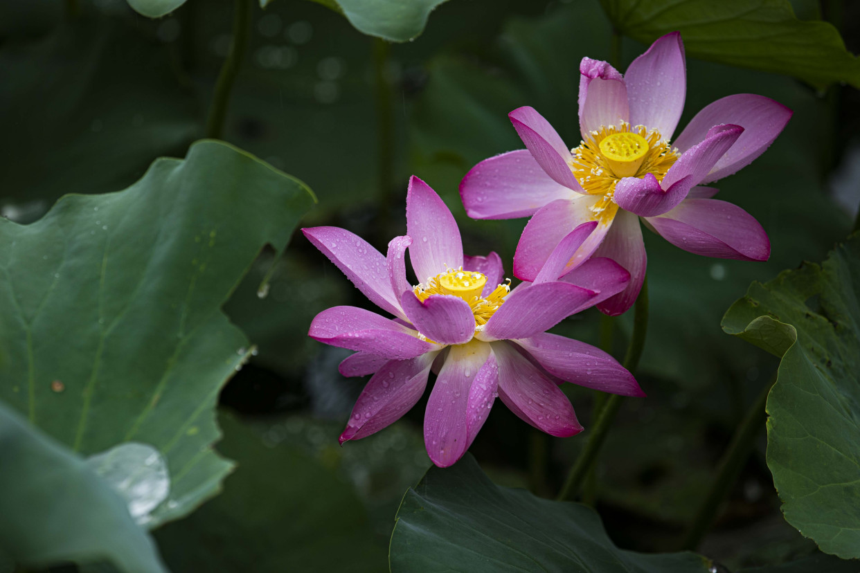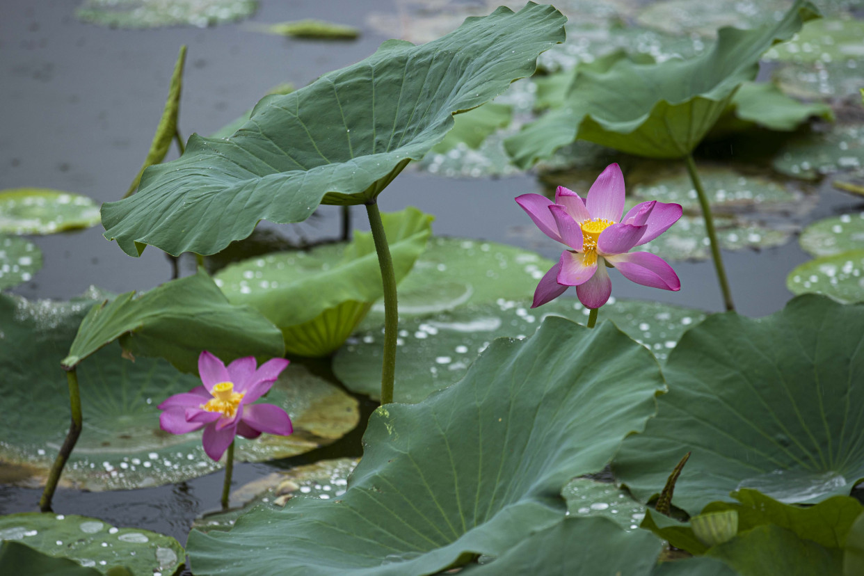 放眼望去,层层叠叠的荷叶错落有致,不时有雨水低落。粉红的花瓣和金黄色的花蕊,在雨水的冲洗下更加艳丽。