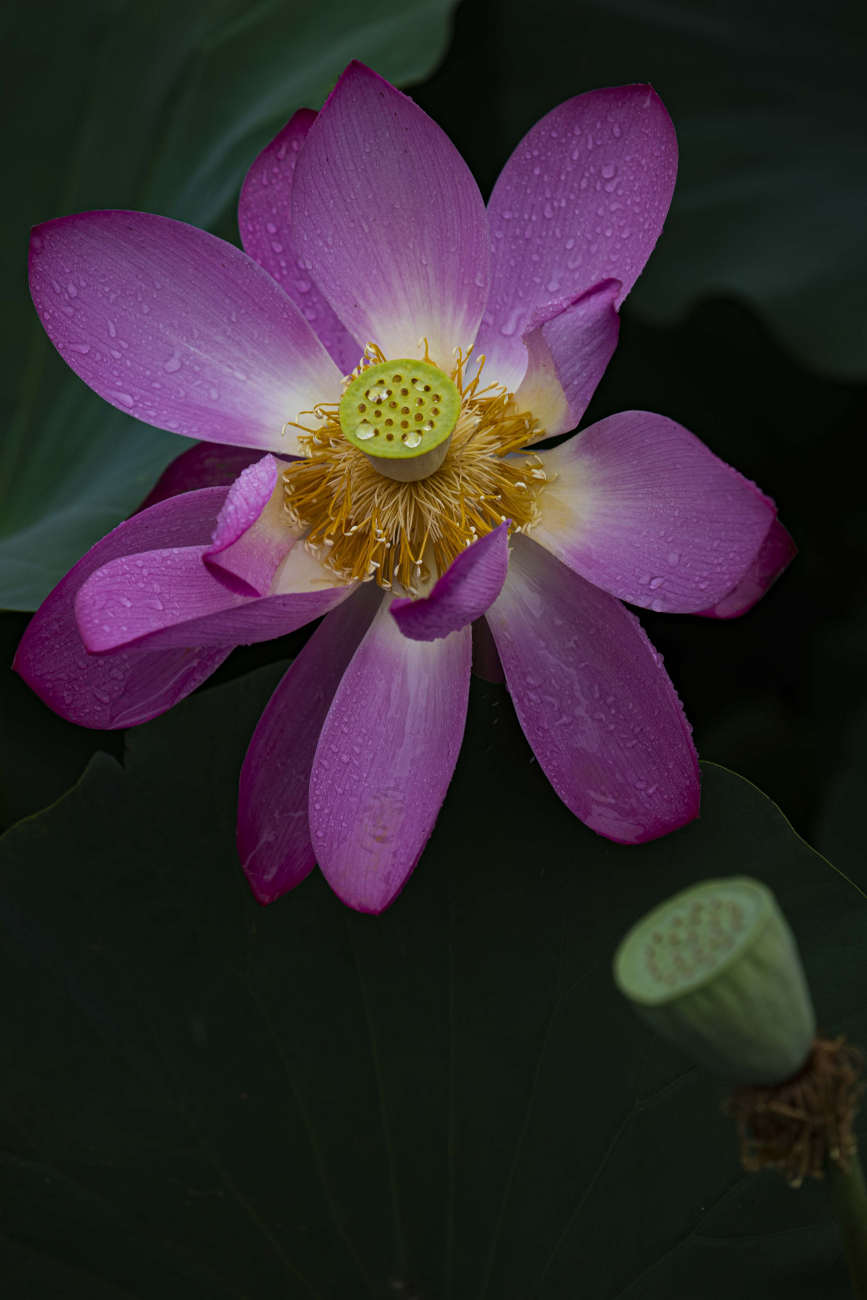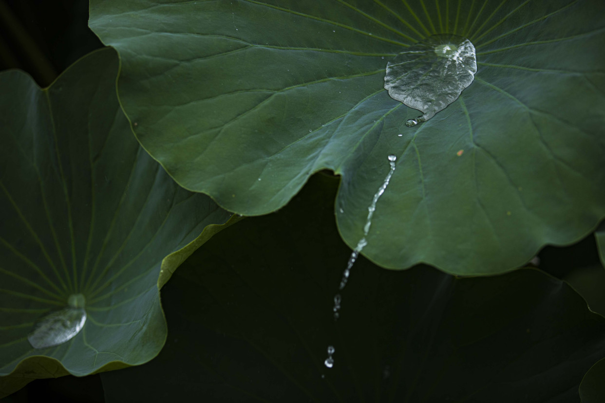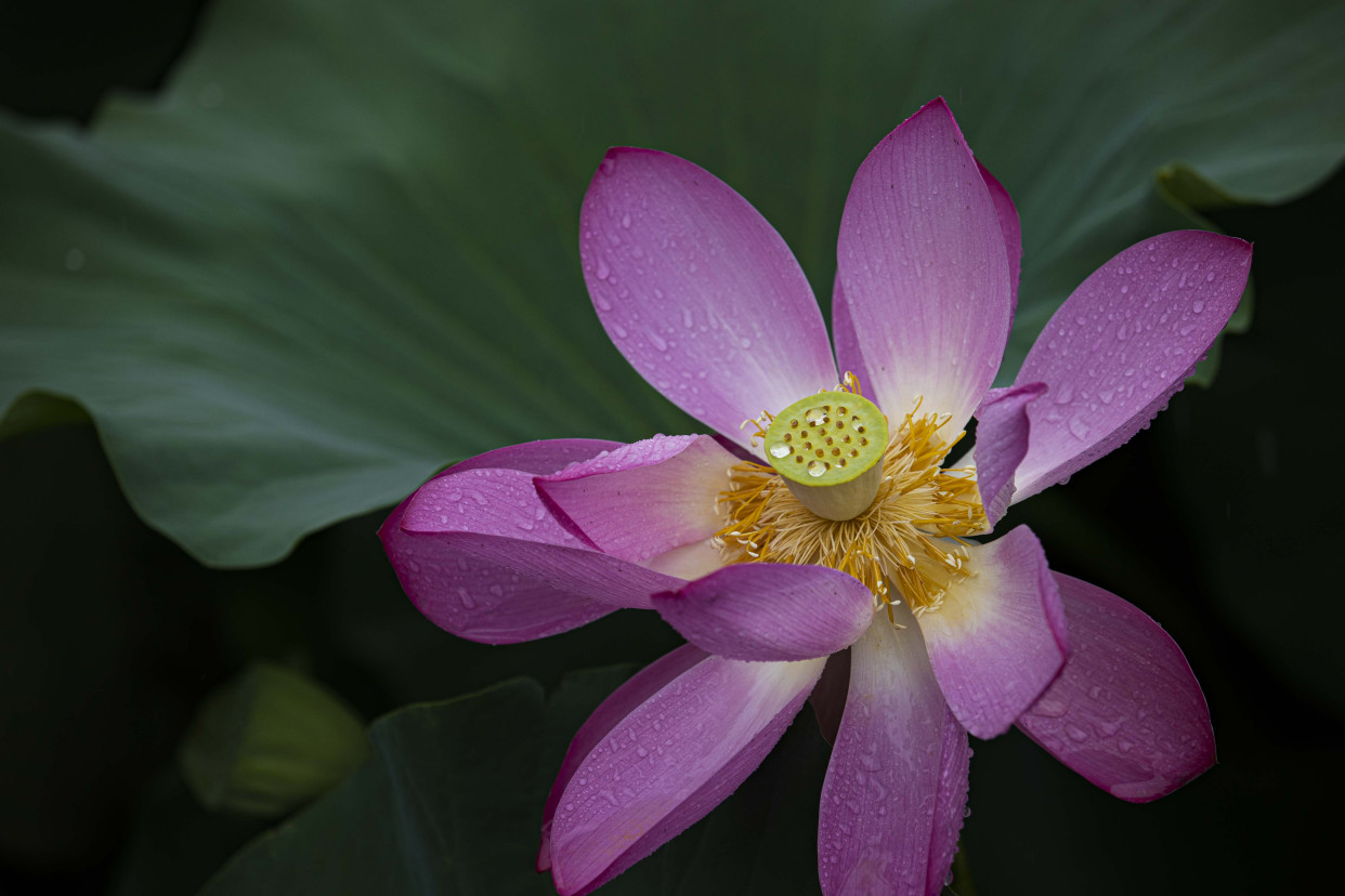 放眼望去,层层叠叠的荷叶错落有致,不时有雨水低落。粉红的花瓣和金黄色的花蕊,在雨水的冲洗下更加艳丽。