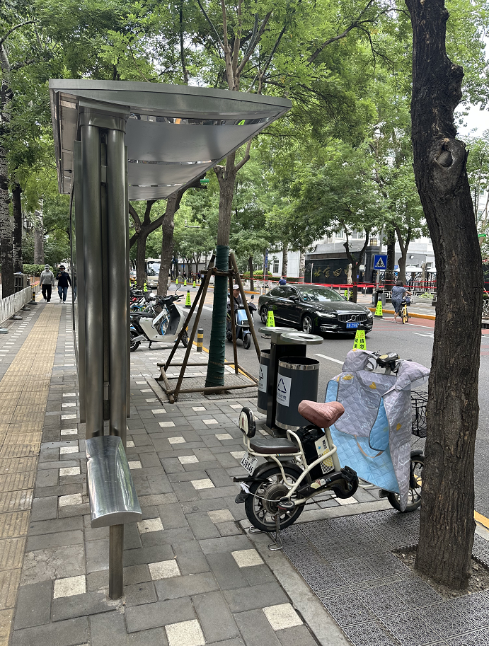 第一个建议——改善公交站台。学生们发现,“北京四中”南行站台前有垃圾桶和树木等影响乘客上下车的障碍物,还有非机动车停靠,对乘客上下车造成安全隐患且不够友好。建议合理安置站台上的公共设施,方便乘客上下车。
