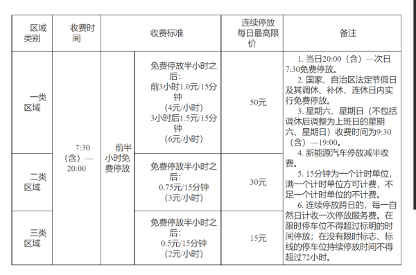 备注:收费区域类别实行动态调整,由市公安机关交通管理部门按规定程序组织实施。