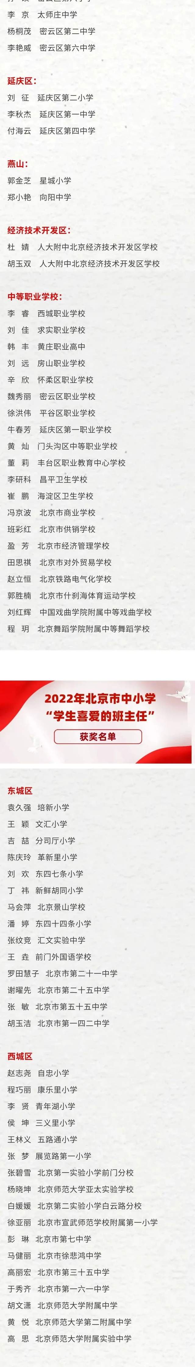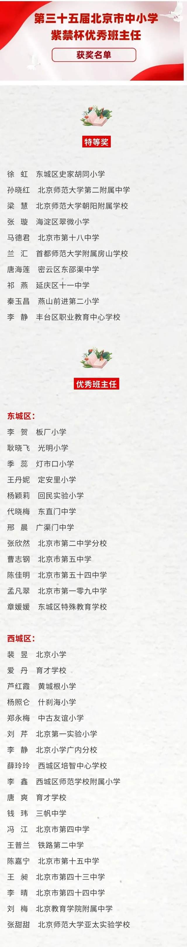 近日,第三十五届北京市中小学紫禁杯优秀班主任获奖名单、2022年北京市中小学“学生喜爱的班主任”获奖名单公布,快来看看有没有你的老师吧!