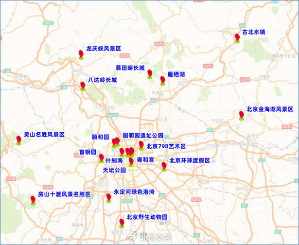 环球度假区、八达岭、居庸关、古北水镇、雍和宫、颐和园等热度较高,八达岭野生动物园、八达岭水关长城等景区距离较近,京藏高速八达岭段和部分出口可能出现短时车辆排队的情况。