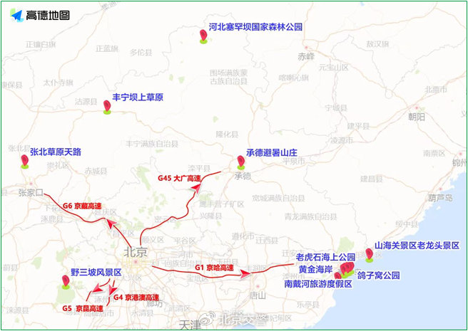 暑假假期期间,自驾去往周边省市景区游玩有所增多,张北草原天路、承德避暑山庄、秦皇岛等周边省市景区景点和我市部分公园将成为出游热点地区。京哈高速、京藏高速、京新高速、京承高速、京港澳高速、大广高速、京昆高速等出京方向车流量增大,机场高速进出京双向交通压力也都比较大。周六日的上午时段,京藏、京承、京新高速出京方向以及郊区景点周边的部分道路交通压力突出;下午时段高速、国道的进京方向将出现返程车流高峰。