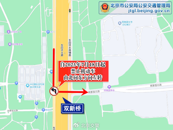 为保障北京朝阳站周边道路交通安全顺畅,根据道路交通安全法律法规有关规定,决定自2023年7月18日起,朝阳区双新桥下路口禁止机动车由北向东方向左转。