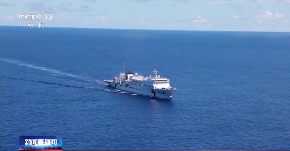 正在执行“和谐使命-2023”任务的“和平方舟”号医院船,接到中国驻基里巴斯大使馆关于1名中国籍渔民在海上作业时右腿开放性骨折的通报后,临时调整航线,经过28小时高速航行后两船在预定海域会合。