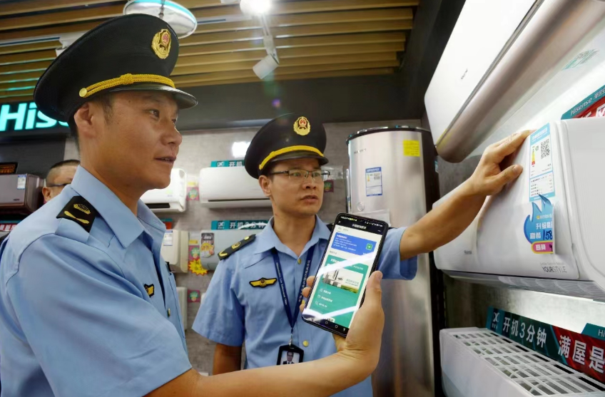 当天,通州区市场监管局在对用水产品水效标识进行检查的同时,还对电冰箱、洗衣机、空调、燃气灶等产品的能效标识使用公示情况进行了同步检查和规范。“我们建议消费者在购买家用电器时可先通过手机扫描能效标识二维码的方式对其能效标准进行核验,多选购1级、2级的高效节能型产品,践行绿色低碳生活理念。”刘凤义说。