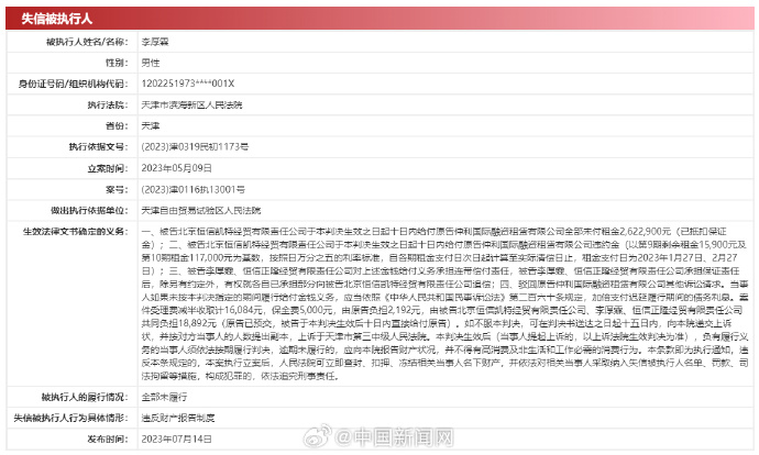 中国执行信息公开网信息显示,因被执行人履行情况全部未履行,I Do钻戒品牌创始人李厚霖被天津市滨海新区人民法院列为失信被执行人。