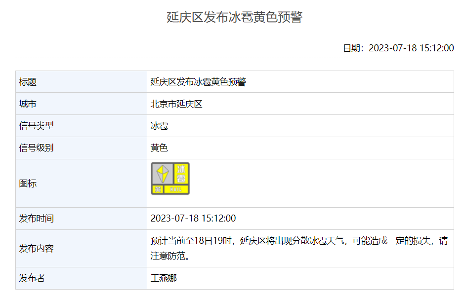 延庆区发布冰雹黄色预警