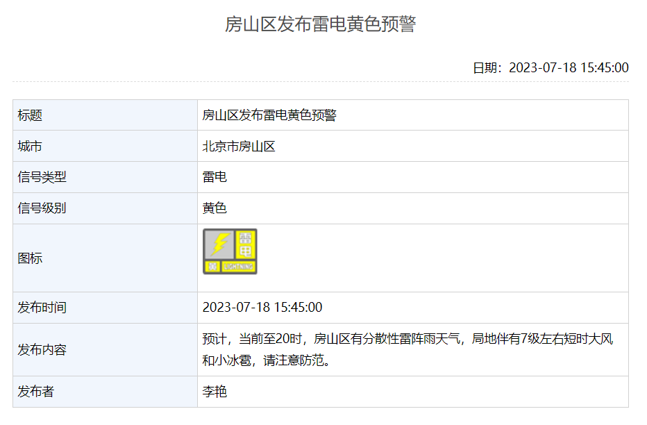 房山区发布雷电黄色预警