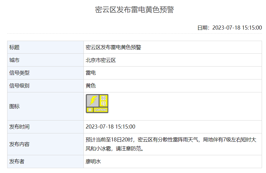 密云区发布雷电黄色预警