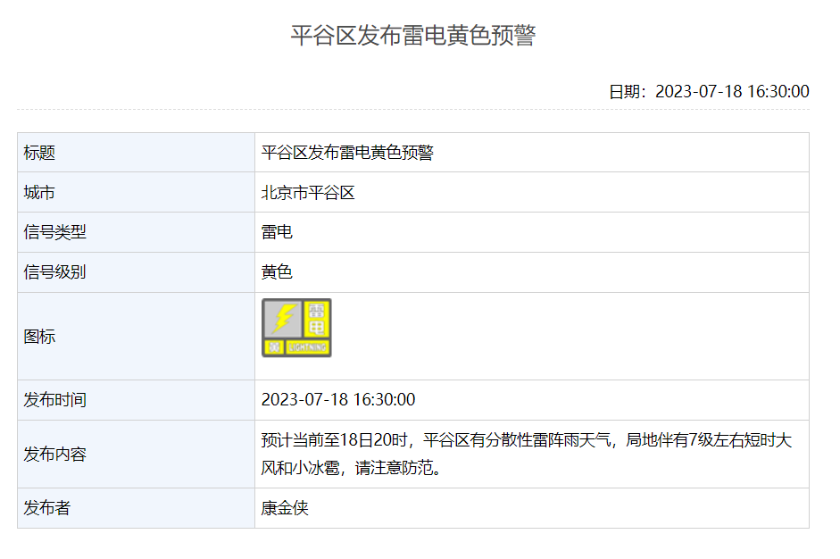 平谷区发布雷电黄色预警