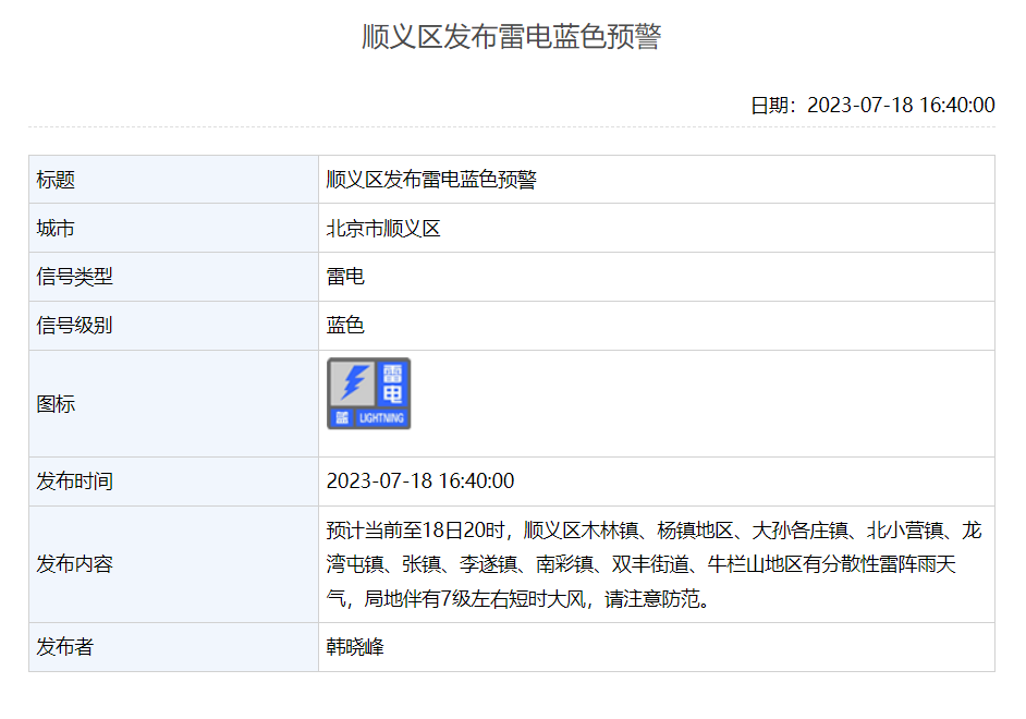 顺义区发布雷电蓝色预警