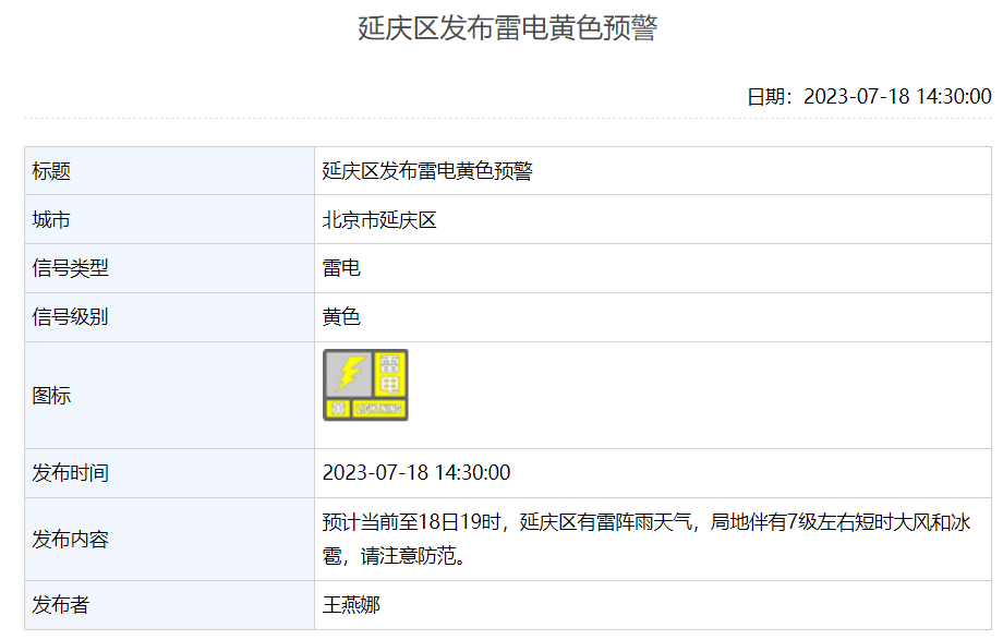 延庆区发布雷电黄色预警