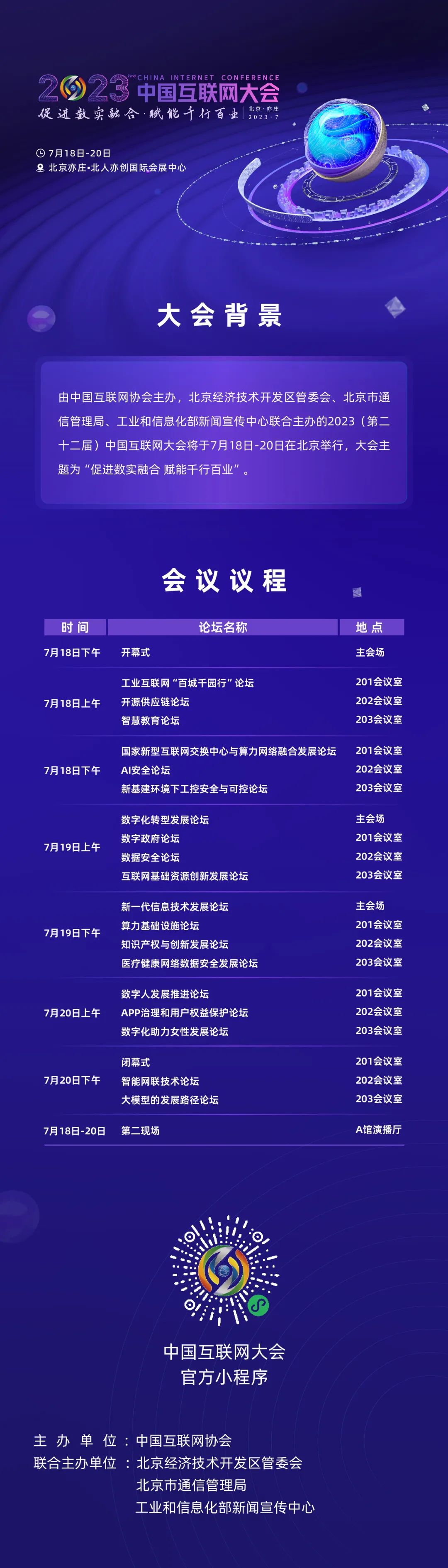 据悉,2023(第二十二届)中国互联网大会于7月18日至20日在北京亦庄举办,除了开幕式和闭幕式,大会还将举办2场主论坛、17场分论坛及多项特色活动。