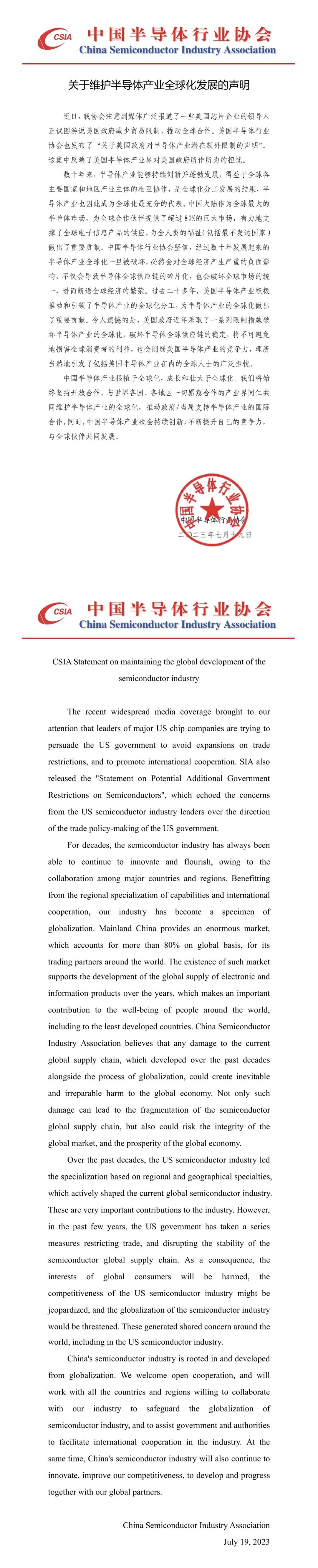 近日,我协会注意到媒体广泛报道了一些美国芯片企业的领导人正试图游说美国政府减少贸易限制、推动全球合作。美国半导体行业协会也发布了“关于美国政府对半导体产业潜在额外限制的声明”。这集中反映了美国半导体产业界对美国政府所作所为的担忧。