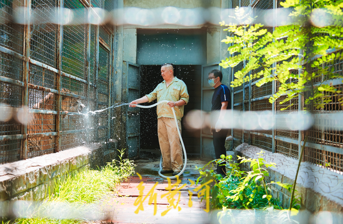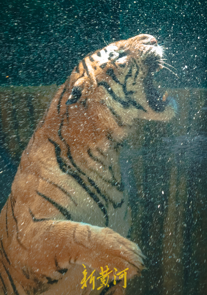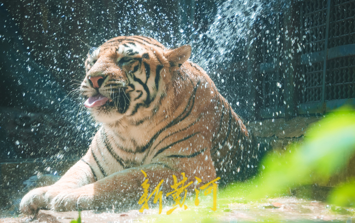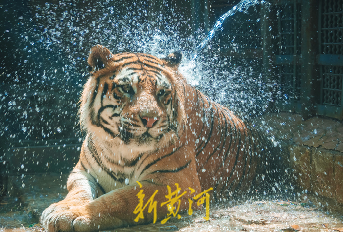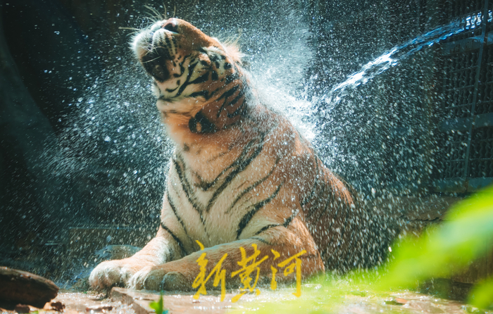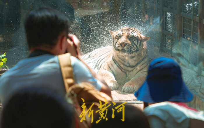 7月19日,济南最高气温达到34℃,济南动物园里的“百兽之王”——老虎们开启了避暑模式。工作人员用水管向笼舍内喷水降温,老虎们趴在笼边,水柱像淋浴一般打湿在虎背上,水花四溅,它们时而用舌头梳理着自己的毛发,时而站起身来喝两口清水,享受着夏日中的凉爽。