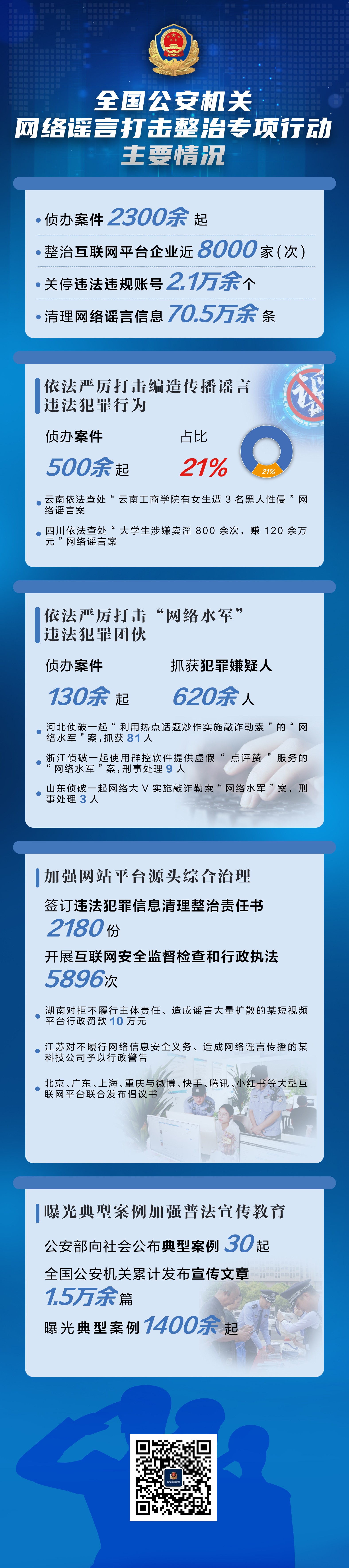 公安部网络安全保卫局政委孙劲峰介绍,近年来,一些社会热点事件中网络谣言乱象频出,严重扰乱社会秩序、影响社会稳定,人民群众反映强烈。对此,公安部部署全国公安机关依法严厉打击借热点案事件编造传播谣言违法犯罪行为,分类分级、依法严厉打击了一批借热点案事件有组织编造传播谣言的策划者、组织者和主要实施者。专项行动中,共侦办此类案件500余起,约占案件总数的21%。其中,云南公安机关对编造发布“云南工商学院有女生遭3名黑人性侵”网络谣言的李某某依法处以行政拘留5日的处罚;四川公安机关对编造发布“大学生涉嫌卖淫800余次,赚120余万元”网络谣言的唐某依法采取刑事强制措施。