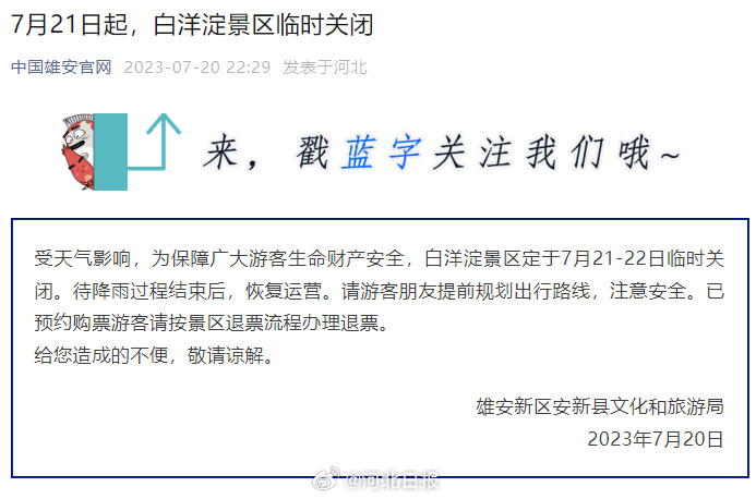 雄安新区安新县文化和旅游局发布通知,受天气影响,为保障广大游客生命财产安全,白洋淀景区定于7月21-22日临时关闭。待降雨过程结束后,恢复运营。请游客朋友提前规划出行路线,注意安全。已预约购票游客请按景区退票流程办理退票。