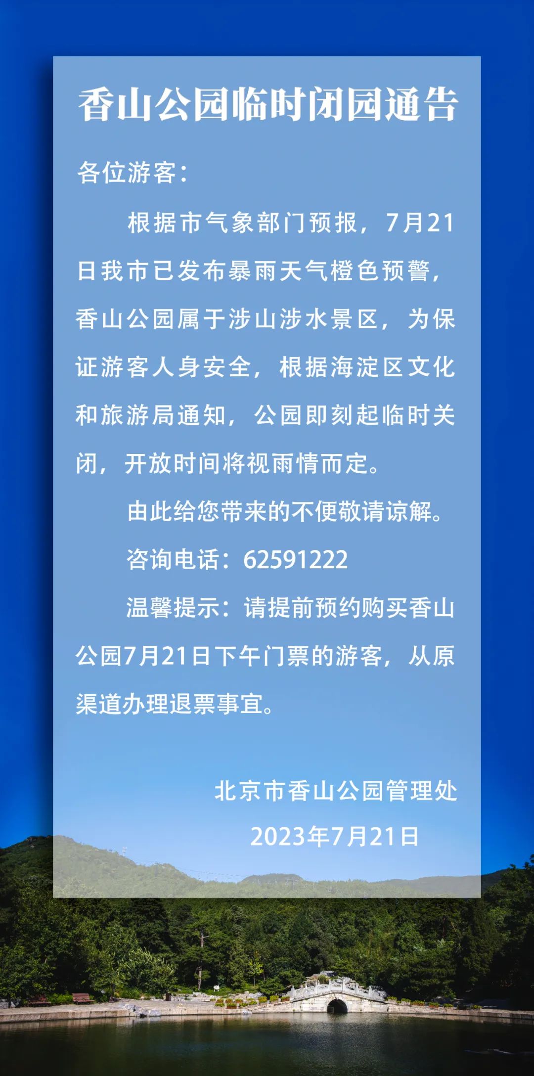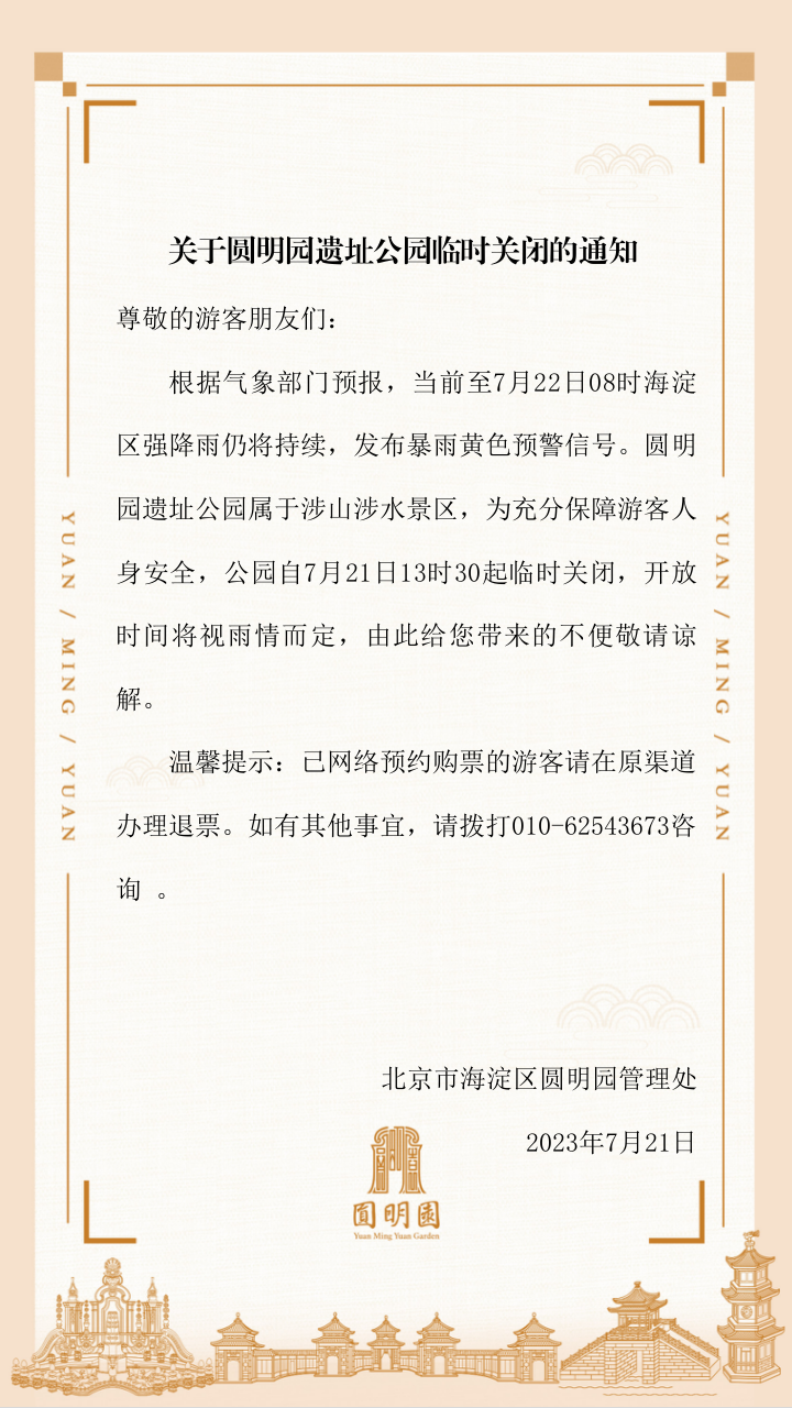 刚刚,受降雨影响,香山公园、国家植物园、圆明园遗址公园发布通告,临时关闭。