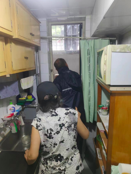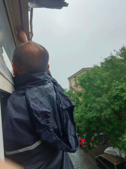大雨未停,他们又赶往另外两户居民家中,排查漏雨原因。“一户住在4层的居民家中是阳台外的外墙保温层破损洇水,导致雨水沿窗檐往内流;还有一户是雨水顺着废旧管道流进了住在地下室的居民家中。我们做了一些临时处理。等到雨停后,外墙干透了,我们会再对漏雨点进行修缮。”社区居委会副主任胡彦彬说。