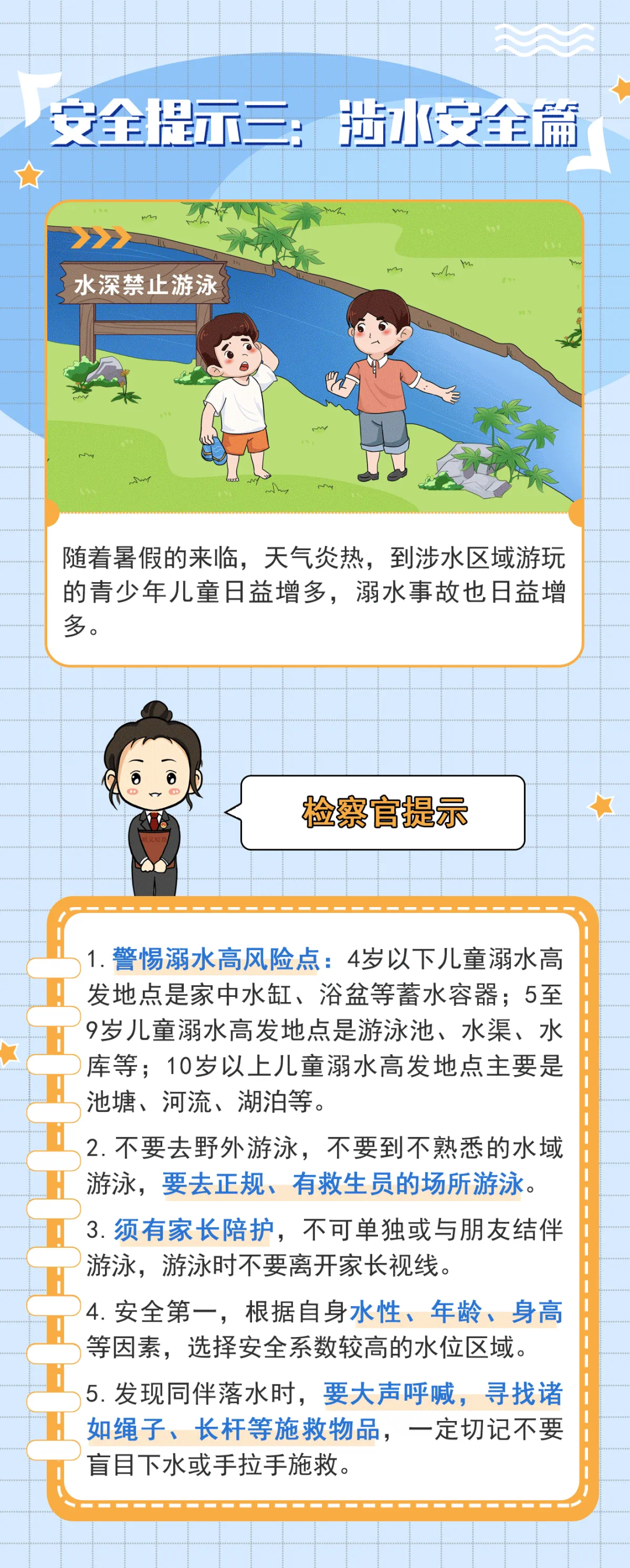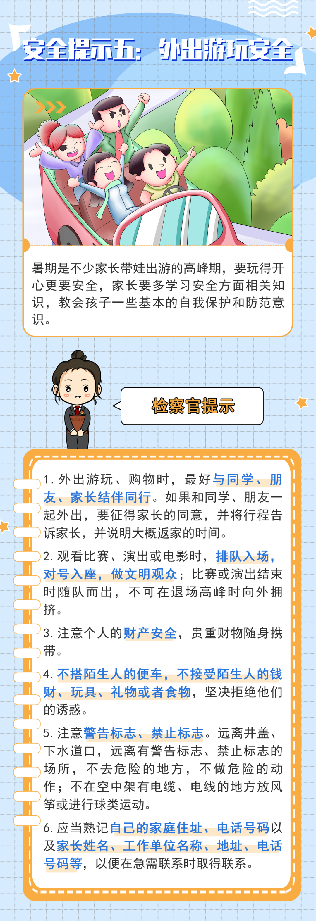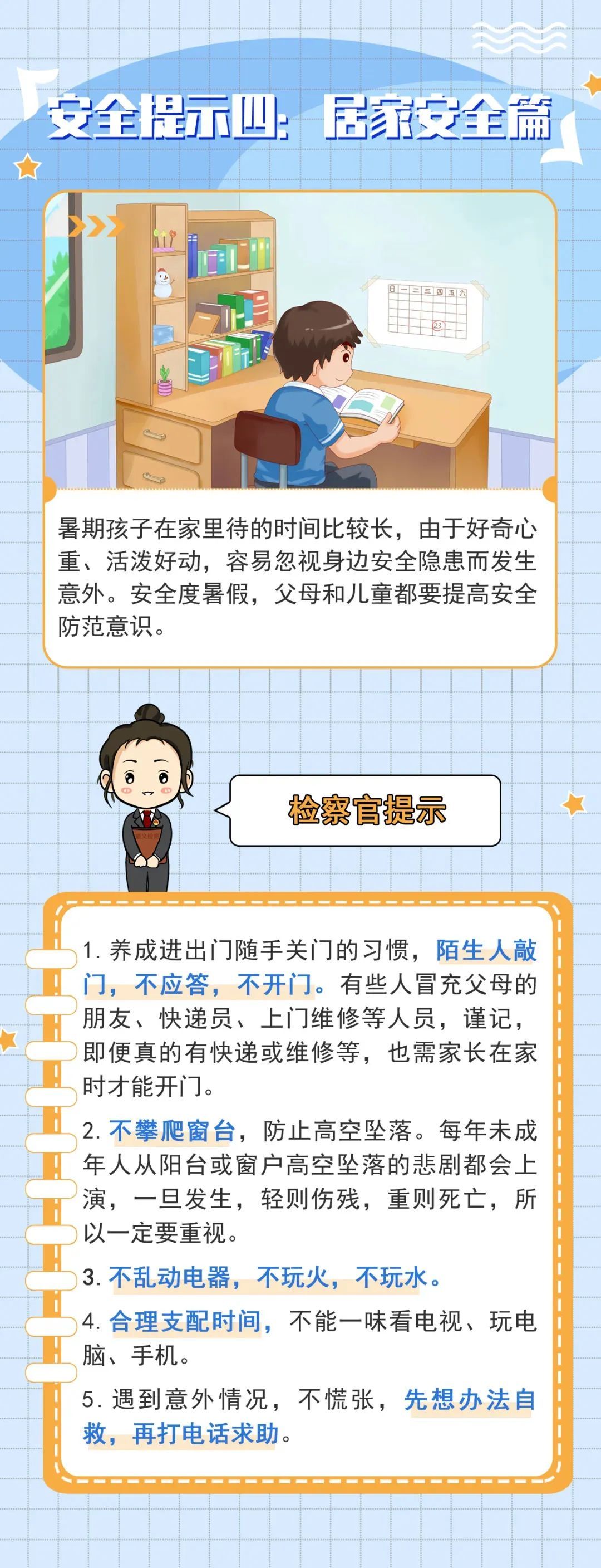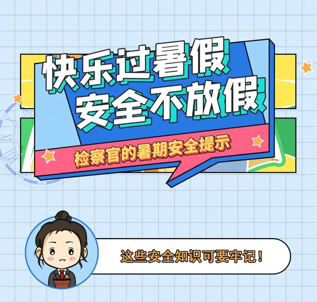 保护好个人信息及隐私,网络交友要留有戒心;马路不是运动场,不要在马路中间嬉戏打闹;不要去野外游泳,到正规、有救生员的场所游泳……区检察院于近日在微信公众号发布了暑期安全提示,从网络、交通、涉水、居家、外出游玩、饮食六方面总结常见安全隐患,提示学生时刻绷紧安全弦。