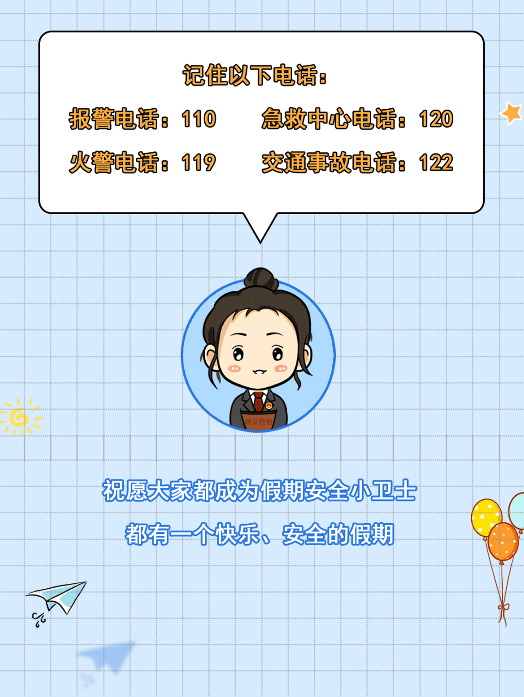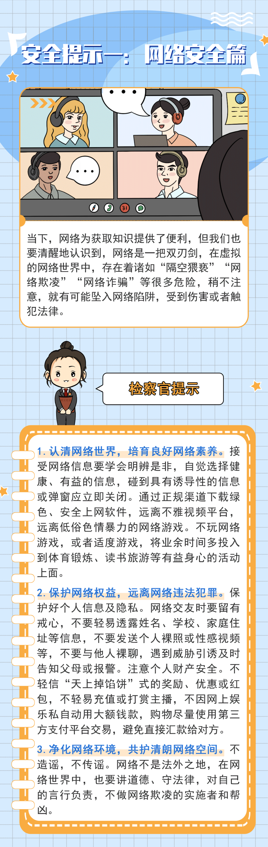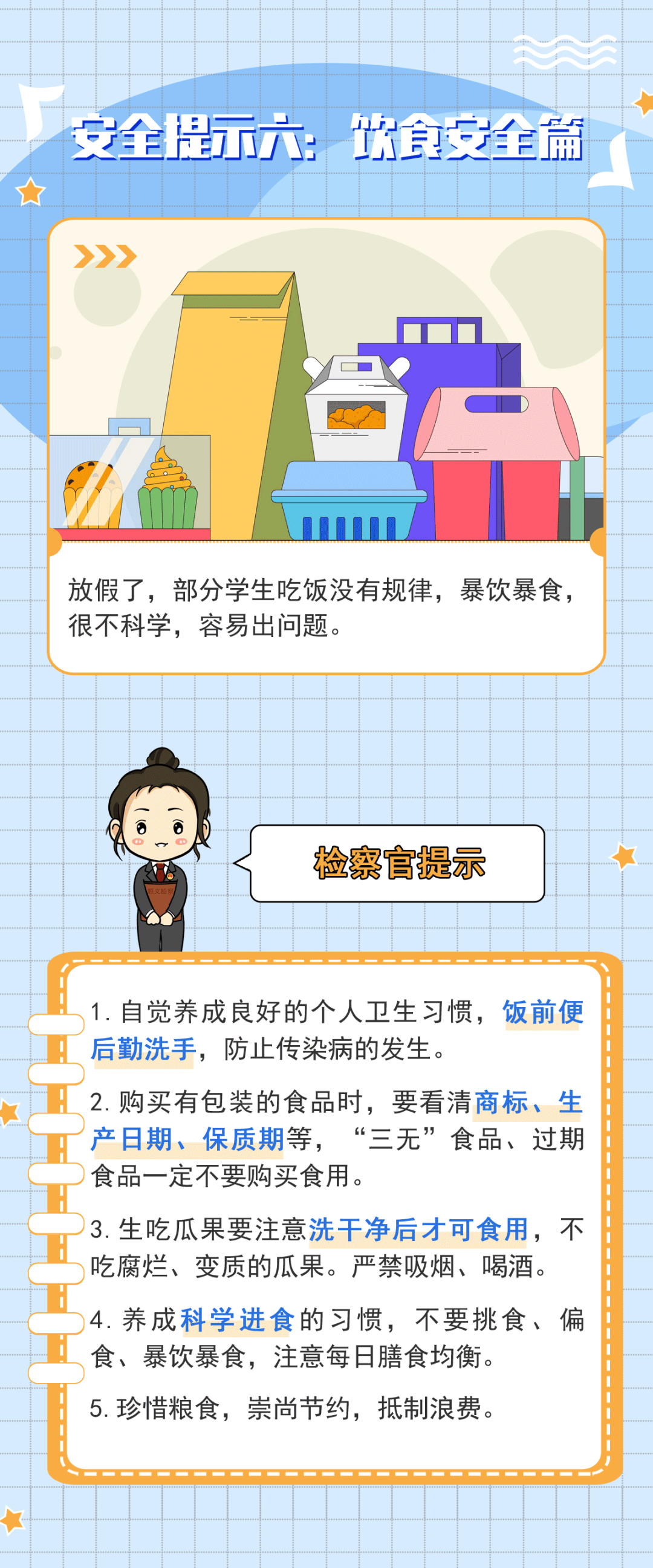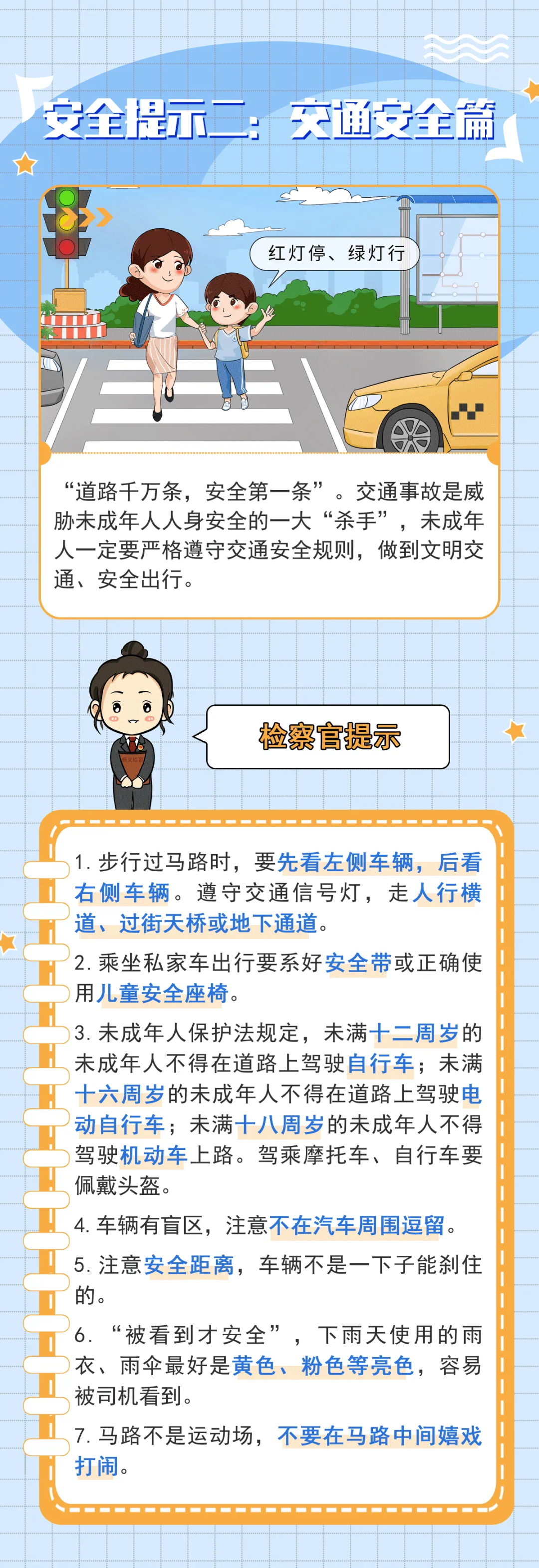 保护好个人信息及隐私,网络交友要留有戒心;马路不是运动场,不要在马路中间嬉戏打闹;不要去野外游泳,到正规、有救生员的场所游泳……区检察院于近日在微信公众号发布了暑期安全提示,从网络、交通、涉水、居家、外出游玩、饮食六方面总结常见安全隐患,提示学生时刻绷紧安全弦。
