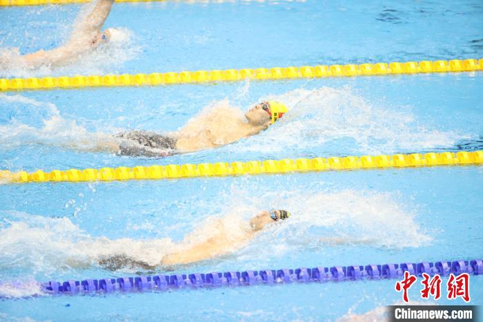 7月24日,福冈游泳世锦赛男子100米仰泳预赛中,中国选手徐嘉余排名第一晋级半决赛。黄色泳帽者为徐嘉余。中新社记者 汤彦俊 摄