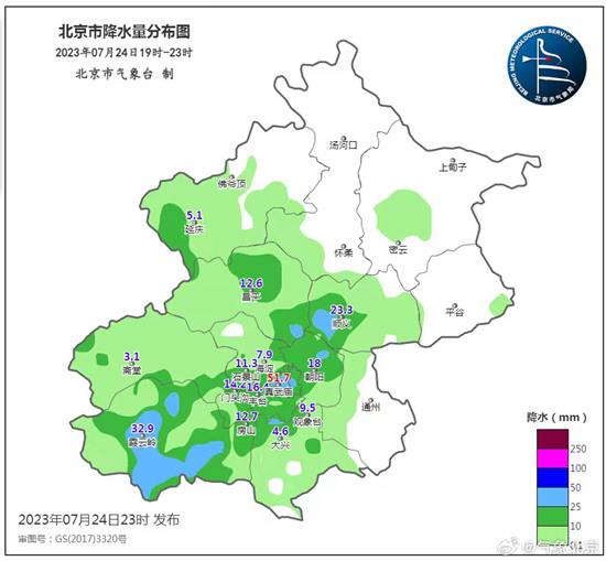 据统计,19时—23时,北京全市平均降水量7.3毫米,全市和城区最大均为西城真武庙,达到51.7毫米,最大小时降水强度西城真武庙51.7毫米/小时(24日22时—23时)。北京市防汛办已启动东城、西城、朝阳、海淀、丰台、石景山、顺义、通州、大兴、房山、昌平区防汛蓝色预警响应。