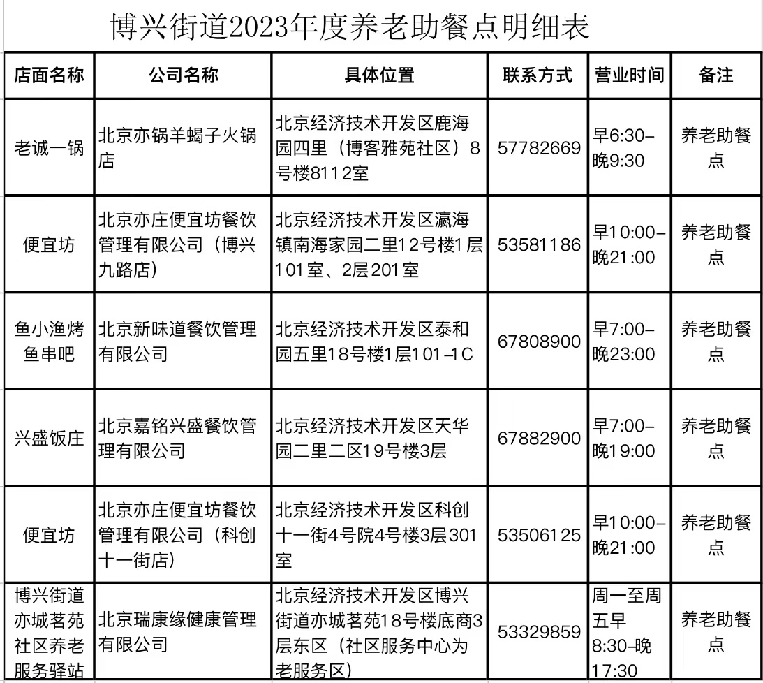 附1:北京经开区博兴街道2023年度养老助餐点明细表