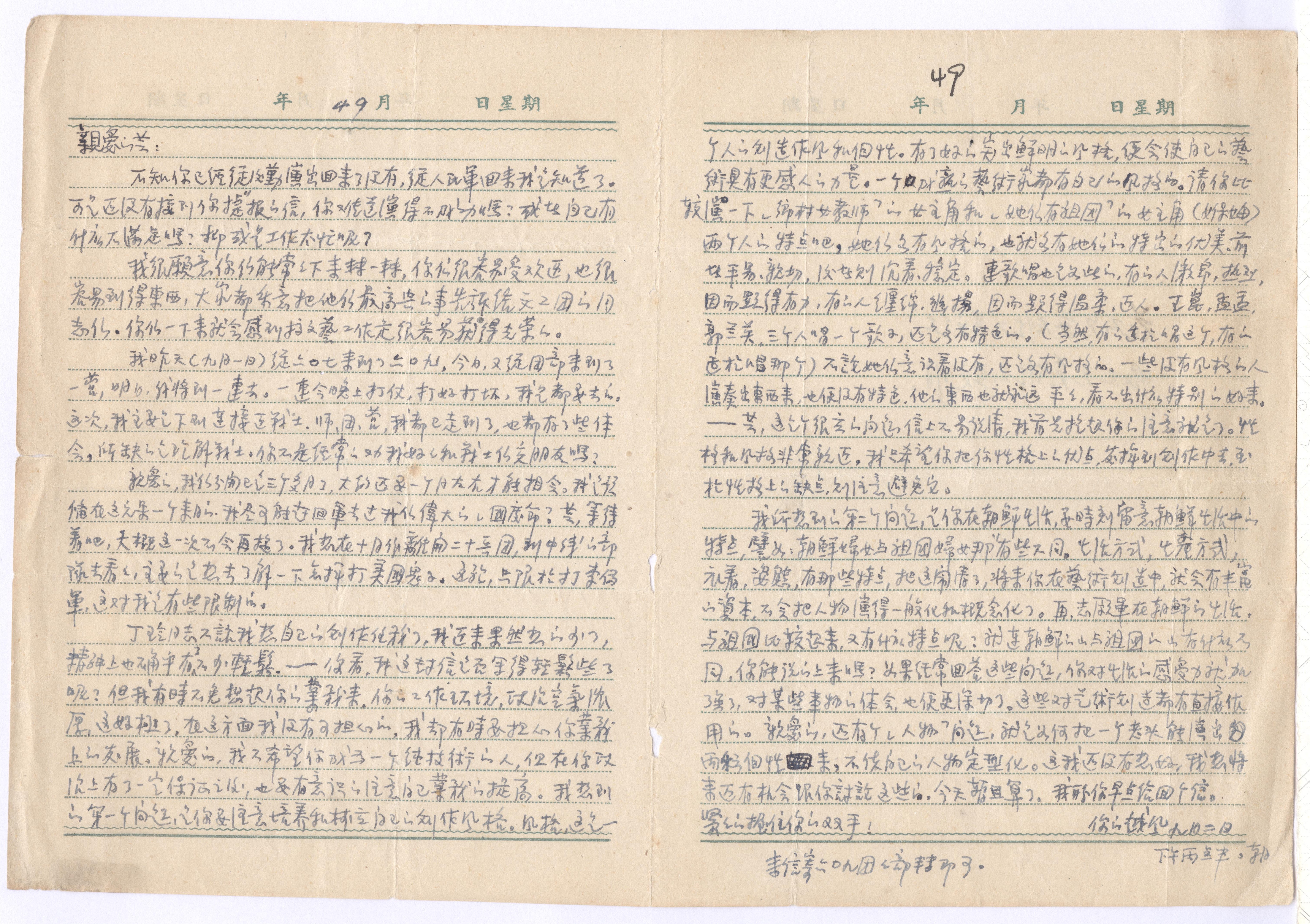 在写给申芸的信中,徐光耀字里行间流露出对女友的牵挂和报国的热情。他在信中感谢女友的善解人意,“你还是那么谆谆劝告我不要为了我们的私生活而影响了工作”;也在信中分享自己的动态,“一连今晚上打仗,打好打坏,我是都要去的。”他承诺,要按照女友劝告的,好好和战士交朋友,更深入地理解战士。