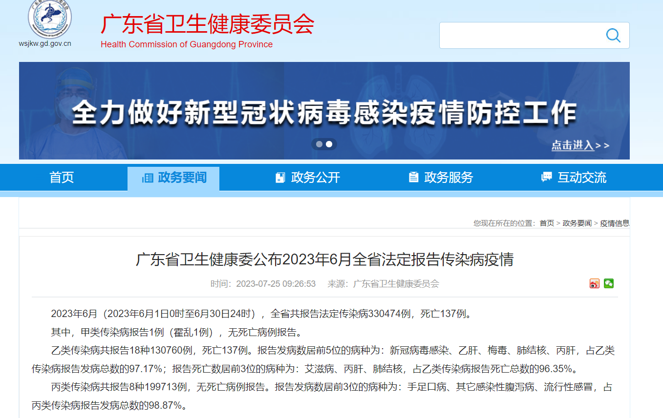 广东省卫生健康委公布2023年6月全省法定报告传染病疫情