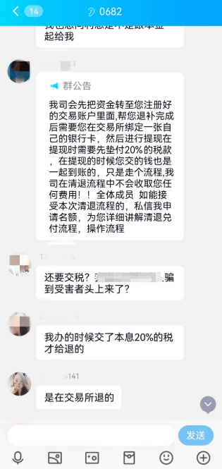 “本次退补流程:因为我司剩余资金都在第三方交易所,各位要在交易所注册一个属于您自己的账号,而后把资金转至您注册好的交易账户里。”这是诈骗者给黄先生爱人所介绍的退款流程。不过,想要提现资金的前提,则是需先垫付总金额20%的税款,“只是走个流程”。