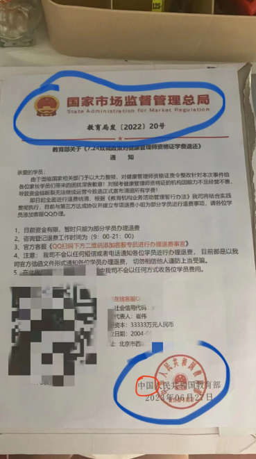 “我没有相信,因为这是另外一家机构。”小陈说。而当她将自己的遭遇发到学员微信群中后不太久,另一位学员表示自己收到一份抬头为“国家市场监督管理总局”、落款却为“教育部”的学费退还通知。