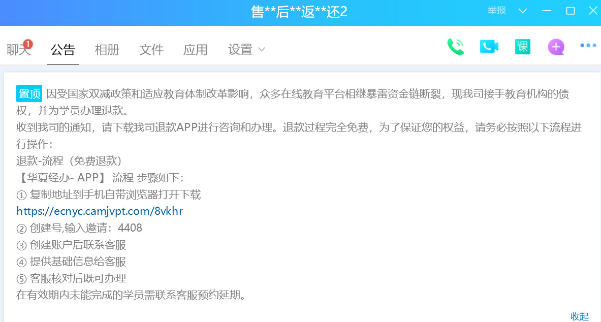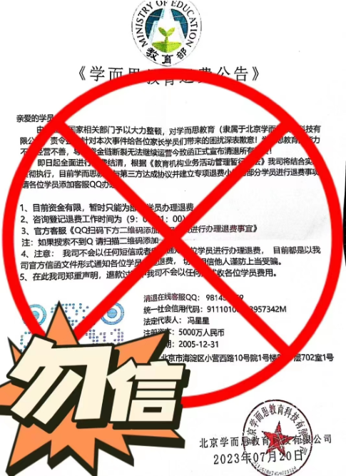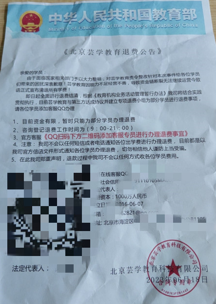 类似“红头”文件并不是个例。小陈在某教育机构交纳5万余元报名学习。机构出现“跑路”现象后,小陈和其他同学便一直在寻求退回学费。然而,近期小陈却收到了一个“退费”快递,拆开却发现是另外一家机构的退费公告。这个公告的文件抬头是“教育部”,落款却是北京一家教育科技有限公司,要求用QQ扫描二维码添加客服专员办理退费。