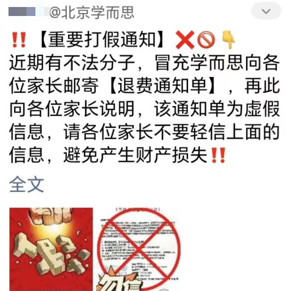 昨天,京城不少学生家长收到学而思教育的打假通知,称有不法分子冒充教育部和公司名义,向家长邮寄所谓“退费通知”,切勿轻信上当。