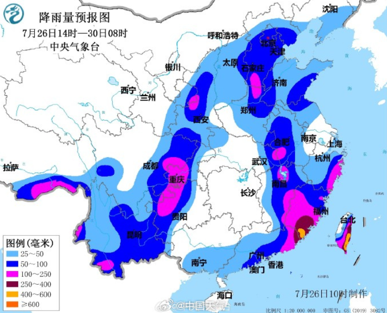 据@中央气象台 今起至29日,台湾、广东、浙江、福建、江西、安徽以及黄淮、华北等地部分地区将先后出现强降雨,上述部分地区累计降雨量有150~250毫米,局地300~500毫米,台湾岛东部局地可达500~700毫米;受台风远距离影响,西南地区东部、西北地区东部也将出现较强降雨。