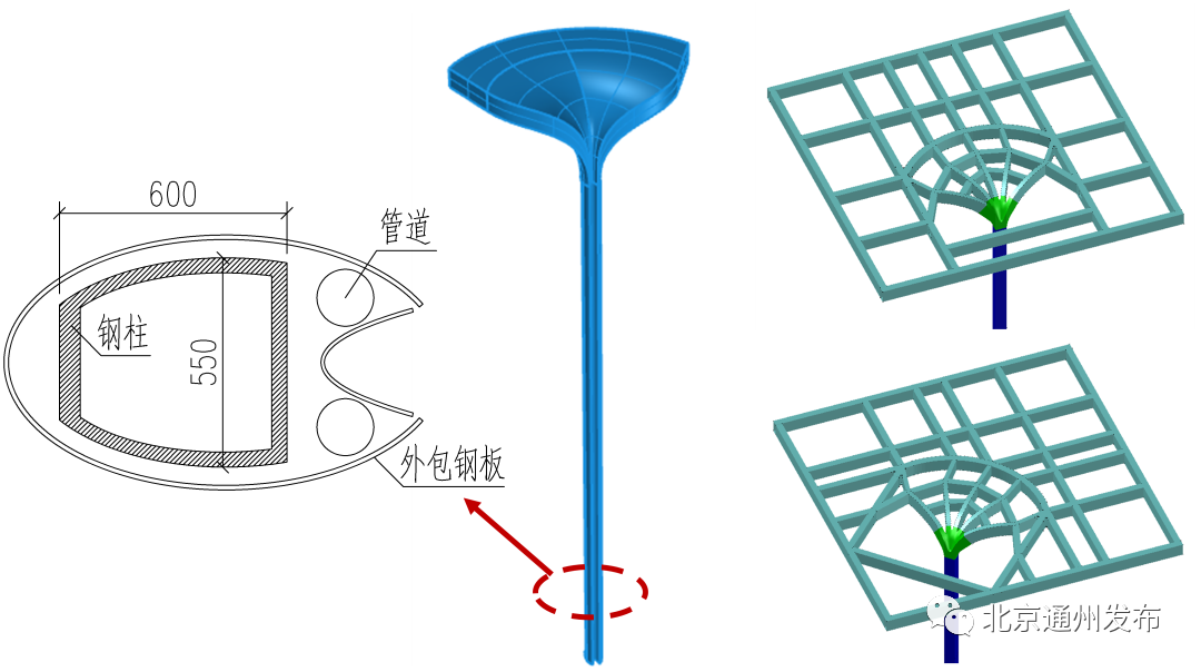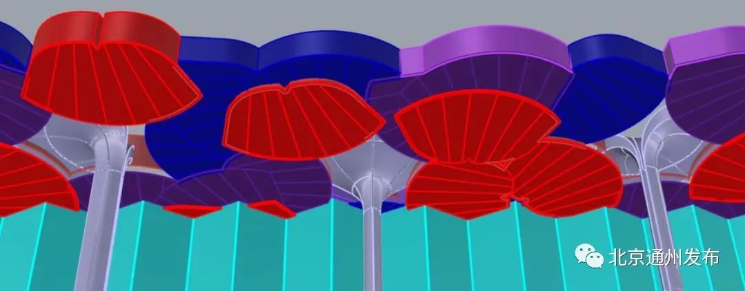 在144棵“银杏树”中,每个单元均包含1片“银杏树”造型的钢柱,以及与柱顶相连的方形屋面梁区域。为了充分利用这些钢柱的刚度,施工方还设置了10道水平屈曲约束支撑(BRB)。
