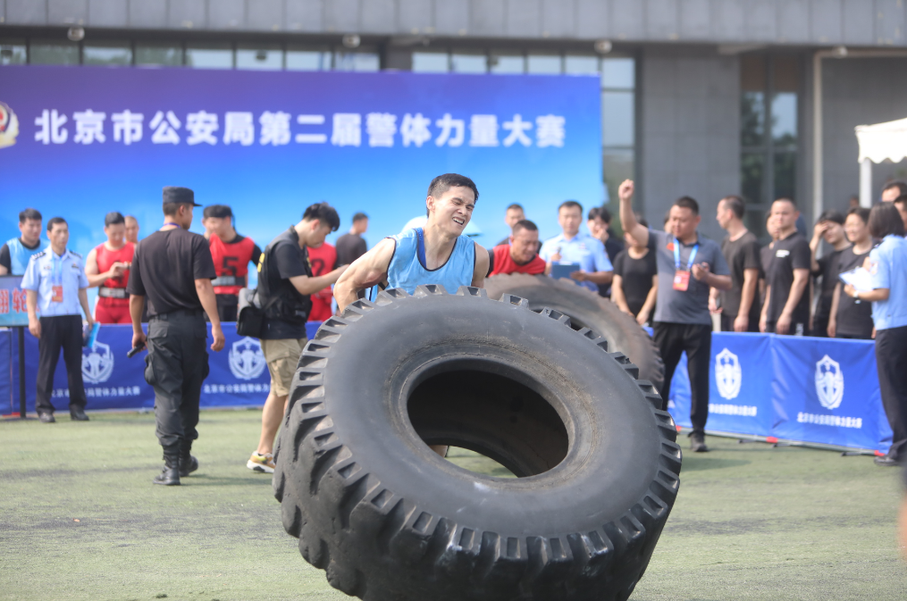 180公斤重的轮胎两分钟之内翻动30余次,肩扛300公斤的车辆30秒行走29米……7月27日,在北京市公安局第二届警体力量大赛上,北京警界的大力士们不断挑战体能极限。