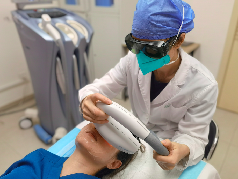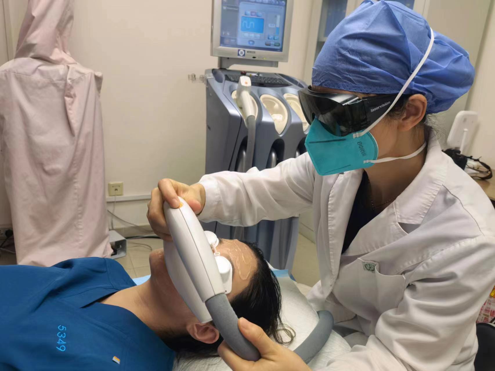 激光治疗室里,医生为小李戴上防护眼镜,并使用激光手具进行光子嫩肤治疗。短短几分钟时间,就完成了治疗。“记得敷上面膜,可以减轻治疗后的不适。”刘方提醒小李,术后皮肤会变得比较敏感,平时还应注意防晒和补水。