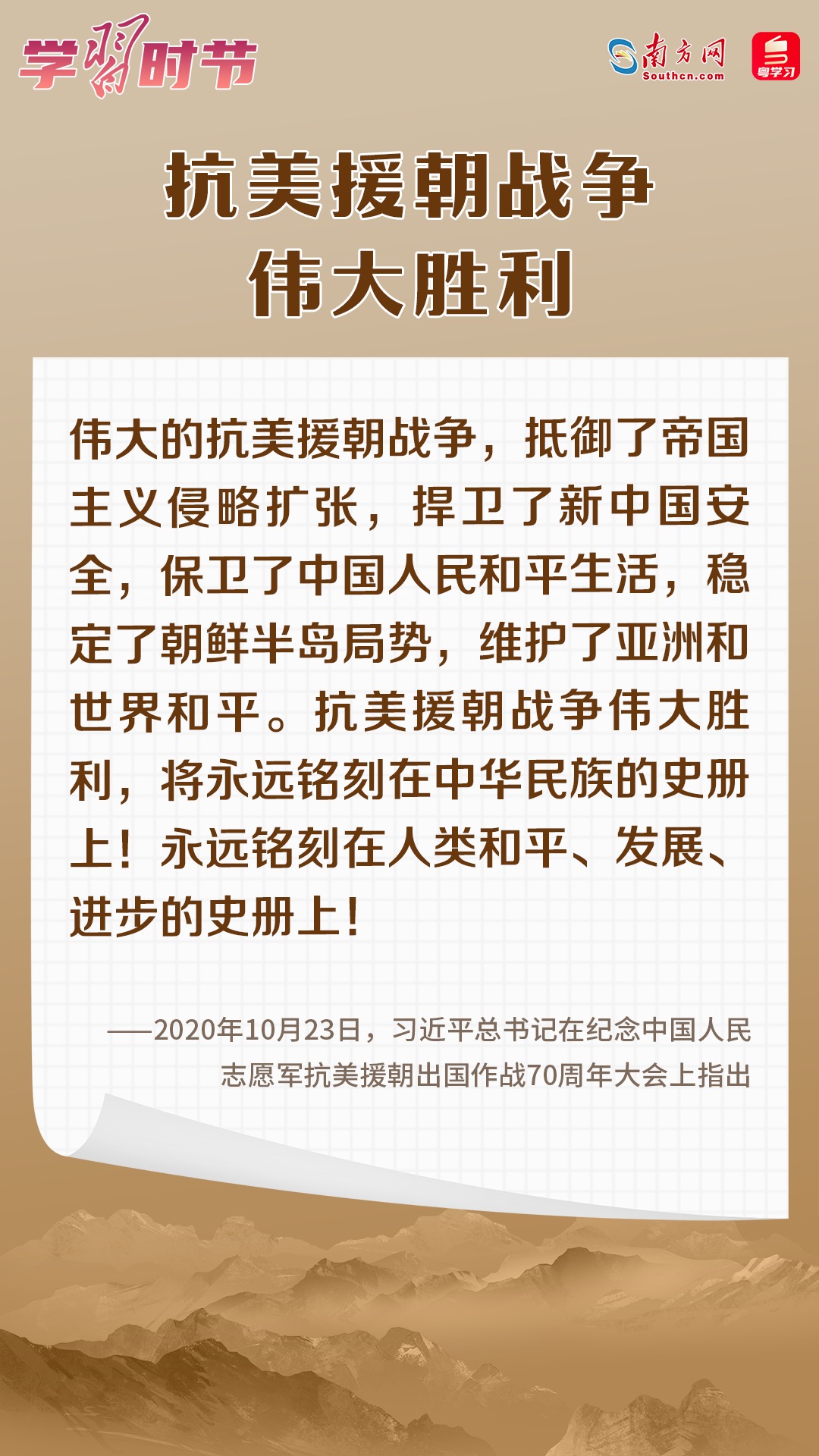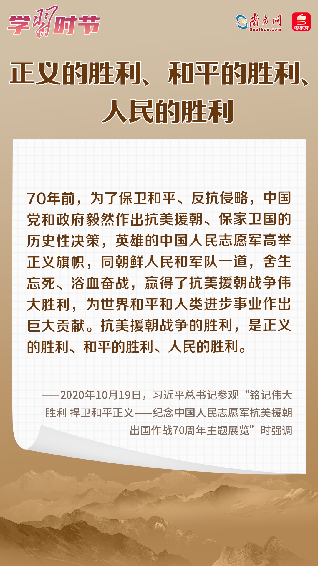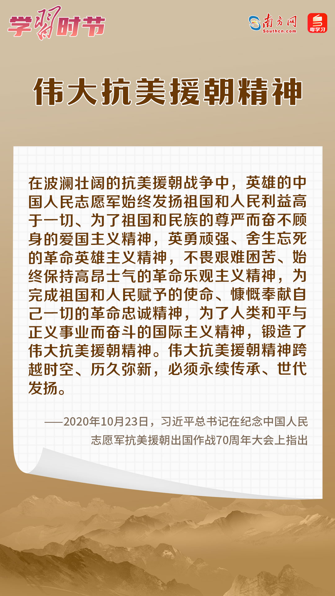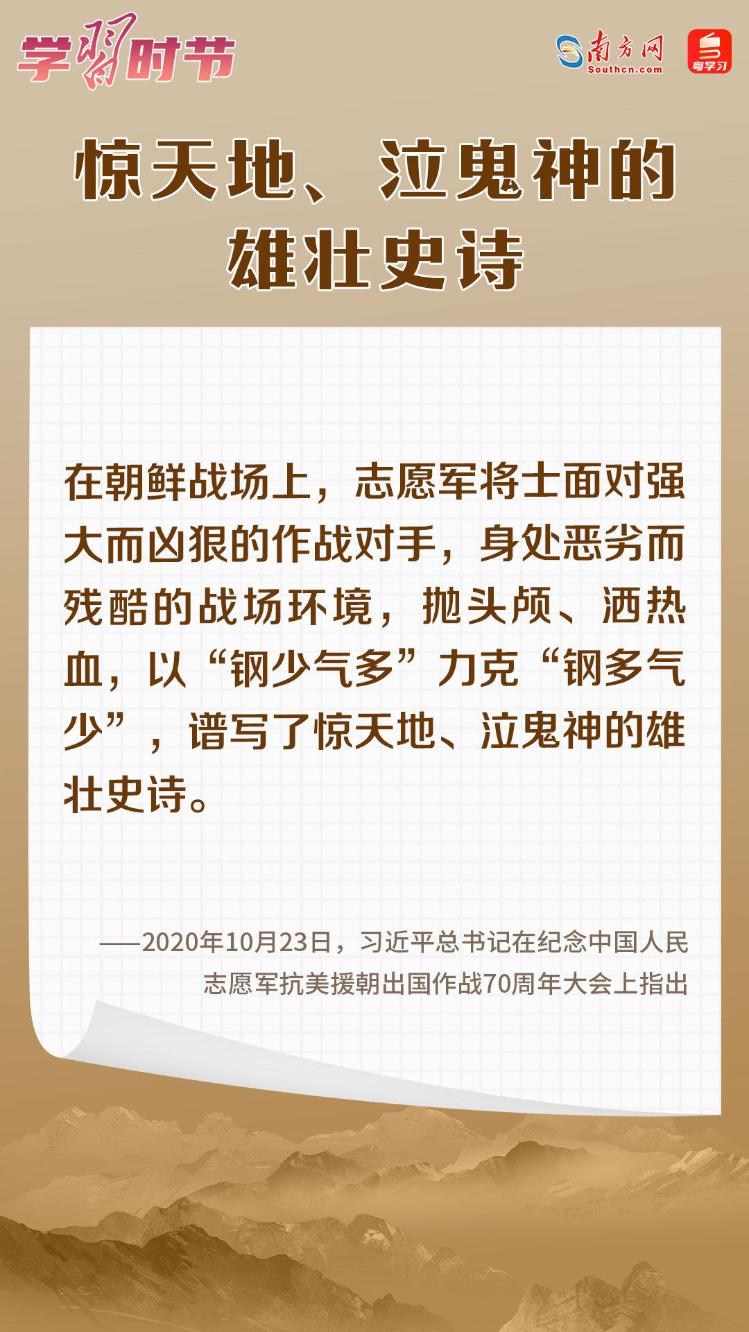 “天地英雄气,千秋尚凛然。”70多年前,由中华优秀儿女组成的中国人民志愿军,肩负着人民的重托、民族的期望,高举保卫和平、反抗侵略的正义旗帜,雄赳赳、气昂昂,跨过鸭绿江,发扬伟大的爱国主义精神和革命英雄主义精神,同朝鲜人民和军队一道,历经两年零9个月艰苦卓绝的浴血奋战,赢得了抗美援朝战争伟大胜利。
