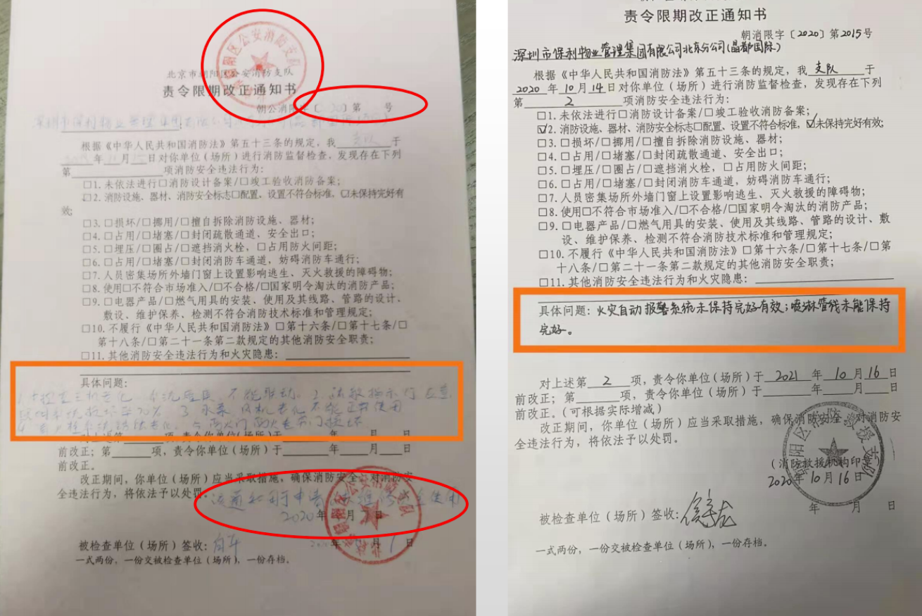 “我们小区的消防系统3年前就瘫痪了。”一位居民说。2020年,朝阳区消防救援支队给物业下发的限期改正通知书显示,火灾自动报警、喷淋管线、防火门、应急照明系统、消火栓、水泵、风机都存在不同程度的老化和损坏。
