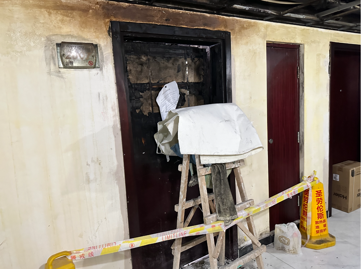 7月26日,记者来到1号楼走访发现,20层楼道的墙面上还有被烧焦、熏黑的痕迹,空气中弥漫着一股刺鼻的呛味。居民家中墙面、家具、地板都被蒙了一层烟尘。多个楼层楼道内的消防应急灯仍是坏的,“逃生通道”的标识灯也不亮。在一些楼层的楼梯口还堆放着大量垃圾,阻碍了逃生通道。