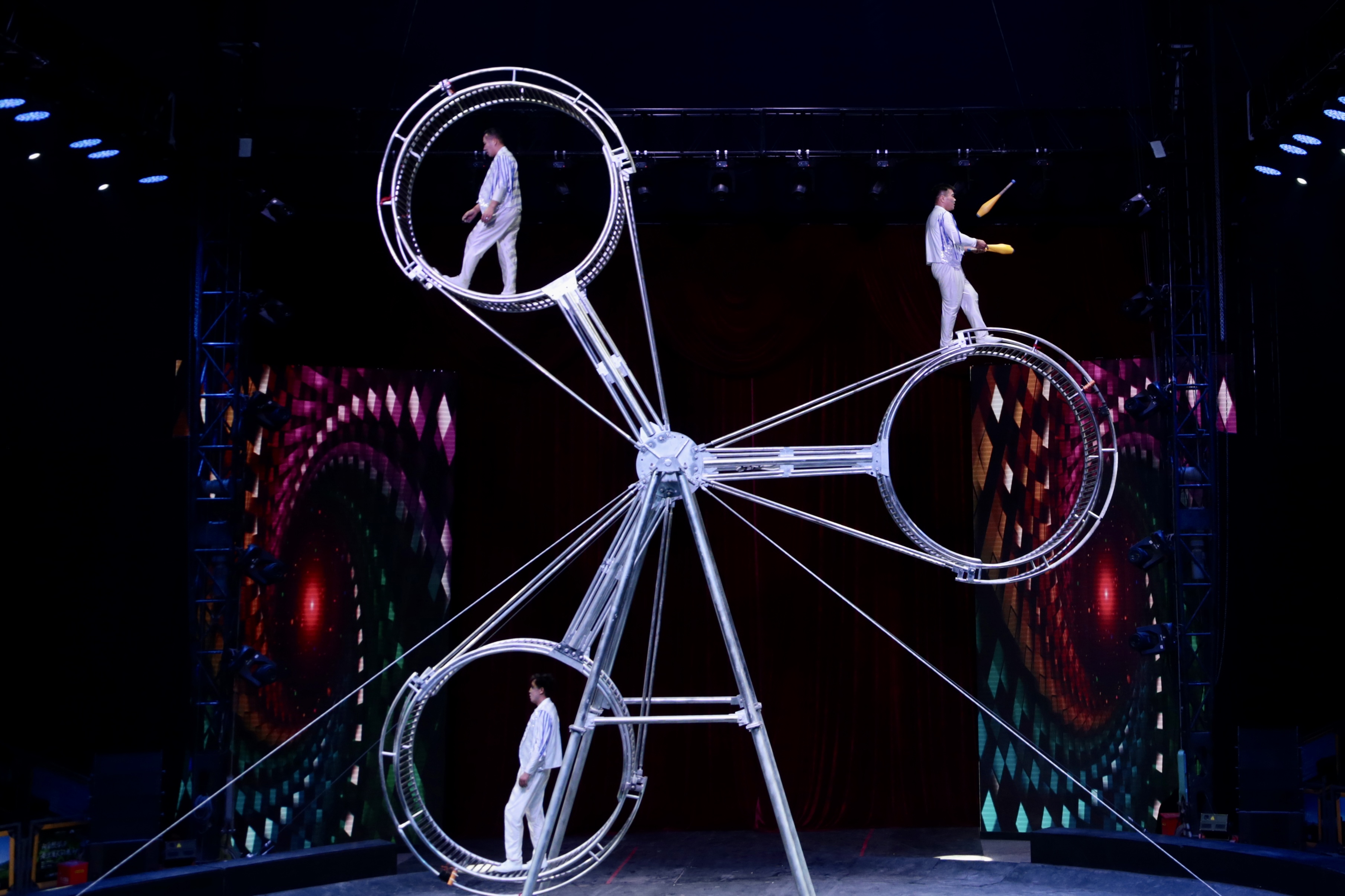 “崇礼大马戏”演出中,中国杂技团专业演员为观众们呈现了荣获过多项国际大奖的金奖节目《俏花旦—集体空竹》,同时还整合了来自中国、俄罗斯、乌克兰、哈萨克斯坦等多个国家的专业演员,表演环球飞车、高空魔轮、火热舞蹈、滑稽小丑等节目,为观众带来中西合璧的精彩大秀。