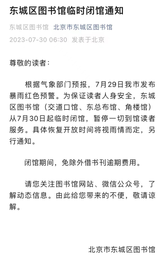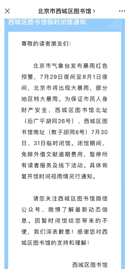 根据北京市气象台发布暴雨红色预警,首都图书馆、朝阳区图书馆、通州区图书馆、海淀区图书馆及海淀北馆、西城区图书馆均在各自官方微信上发出通知,7月30日、31日临时闭馆,暂停到馆读者服务和展览、讲座等各项活动,具体开馆时间视雨情而定。