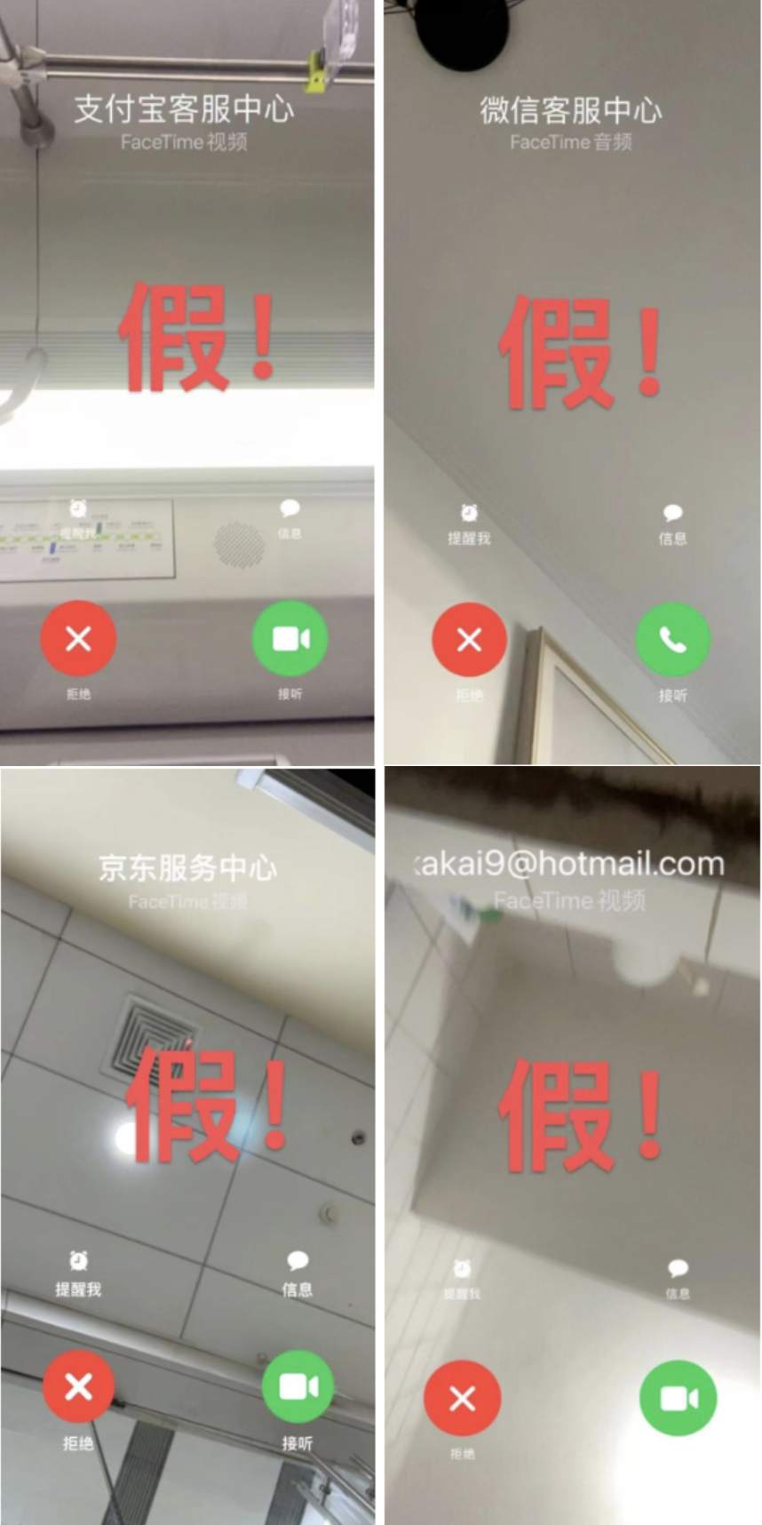 骗子假冒微信、支付宝、京东商城等金融平台客服,利用盗取的AppleID等信息点对点接入,通过FaceTime向受害人发起通话邀请。
