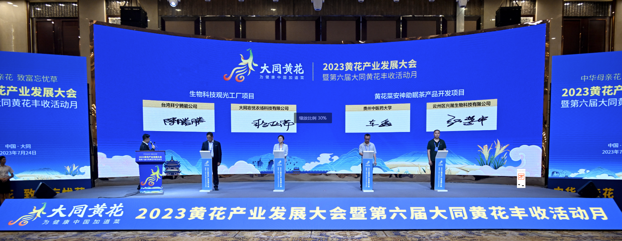 大同市政府与北京供销社、中国台湾拜宁腾能公司与大同忘忧农场、贵州中医药大学与云州区兴晟生物科技有限公司等签订合作协议。这些重点项目的签约为政府与企业、企业与企业搭建合作共赢的桥梁,共同推动黄花产业向规模化、标准化、产业化转型升级,进行深度开发加工,延伸产业发展链条,提升大同农业高质量发展水平。