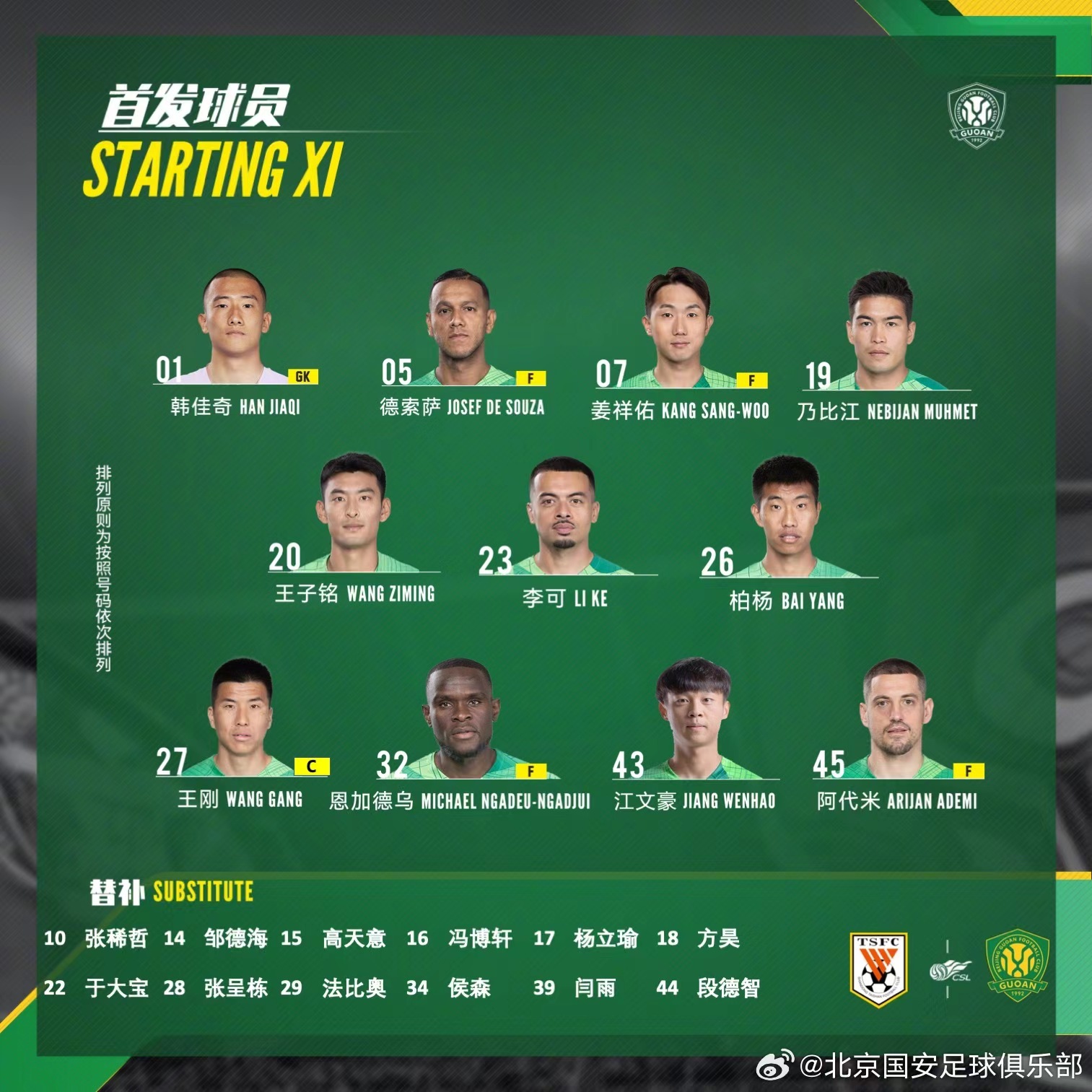 国安队上轮联赛主场击败青岛海牛,新援法比奥送出一次助攻。本场,主帅苏亚雷斯依然没有派他首发,而是延续了此前的451阵容。具体首发11人为:门将韩佳奇,后卫江文豪、柏杨、恩加德乌、王刚,中场德索萨、李可、阿代米、乃比江和姜祥佑,前锋王子铭。